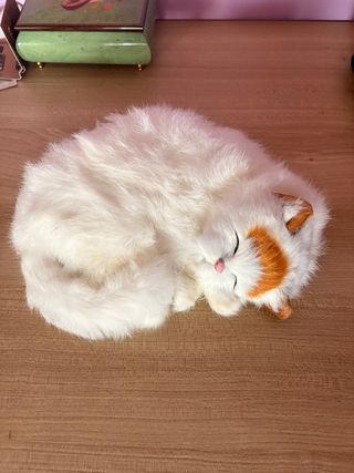 Oggetto decorativo a forma di gatto, perfetto per aggiungere un tocco di dolcezza alla tua casa. La sua posa addormentata lo rende particolarmente tenero. - Pelliccia morbida e folta. - Dettagli color arancio sul pelo e sulle orecchie. - Nasino rosa. - Misure cm 25x20 circa