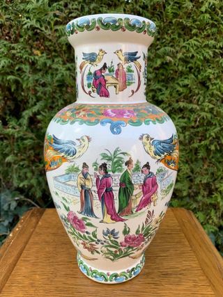 Elegante vaso cinese vintage risalente agli anni '80. Presenta una decorazione ricca di dettagli. Vaso cinese vintage anni ’80 altezza 30 cm e larghezza massima 15 cm, ha qualche segno ma non è rotto. - Motivi floreali e figure. - Bordi decorati con motivi geometrici e uccelli.