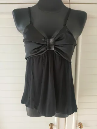 Elegante top canotta nero. - Tessuto satinato sul busto. - Decorazione centrale con strass. - Spalline sottili regolabili. - Taglia M.