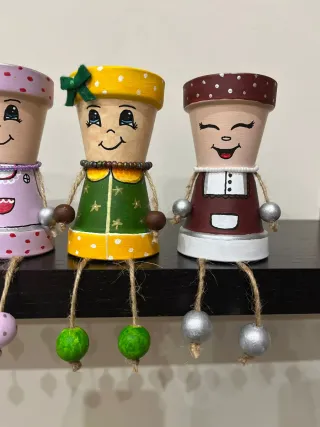 Vasetti di terracotta realizzati e decorati a mano con colori acrilici Maimeri. - Personaggi dipinti a mano con dettagli colorati. - Gambe in corda con perline. - Ideali per decorare mensole o scaffali. (Vengono creati su richiesta, sono opere uniche)
