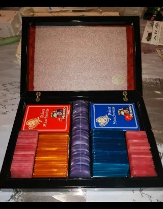 Elegante scatola Vintage "Fiches in Lire" x il poker Modiano - In legno pregiato di radica. - Carte da gioco Modiano Poker Mascherine (rosse e blu). - Gettoni colorati in madreperla da poker in vari colori (viola, arancione, rosa, blu).