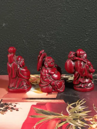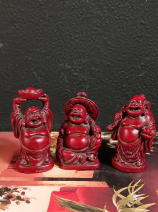 Set di tre statuine decorative raffiguranti il Buddha sorridente, simbolo di felicità e prosperità. - Colore: rosso. - Materiale: resina. - Dettagli finemente lavorati.