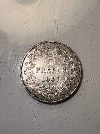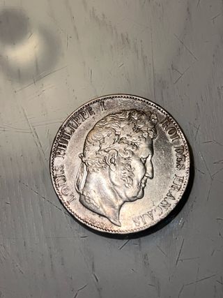 Moneta antica francese del 1845, raffigurante Re Luigi Filippo I. - Dritto: Testa di Re Luigi Filippo I rivolta a destra, con legenda LOUIS PHILIPPE I ROI DES FRANCAIS. - Rovescio: Valore e data. - Materiale: Argento 900