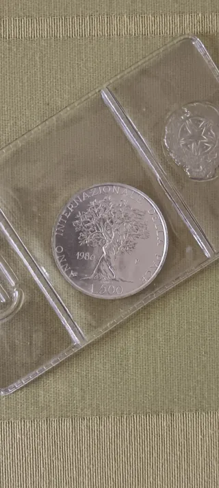 Moneta fiordiconio commemorativa da 500 Lire in argento del 1986, dedicata all'Anno della Pace. Con folder originale della Zecca dello Stato e certificato di autenticità. - Dritto: Albero della vita. - Rovescio: Stemma della Repubblica Italiana. - Anno: 1986. - Valore: 500 Lire. - Metallo: Argento.