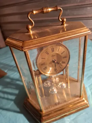 Elegante orologio da tavolo vintage con struttura in ottone e dettagli in vetro. Presenta un quadrante con numeri romani e un pendolo decorativo. - Materiale: vetro - Stile: Classico - Manico superiore per il trasporto - bisogno di essere restaurato