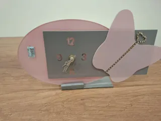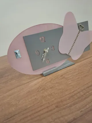 Grazioso orologio da tavolo con un design a farfalla, tipico degli anni '90. - Base in acrilico trasparente. - Quadrante grigio con numeri. - Dettagli decorativi a forma di farfalla.