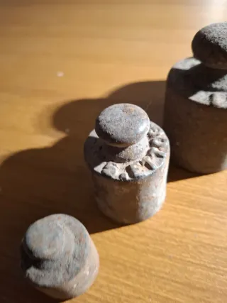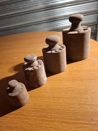 Set di antichi pesi in metallo risalenti agli anni '50. Perfetti per collezionisti o come elementi decorativi. - Materiale: Metallo - Epoca: Anni '50 - Design: Variegato con incisioni
