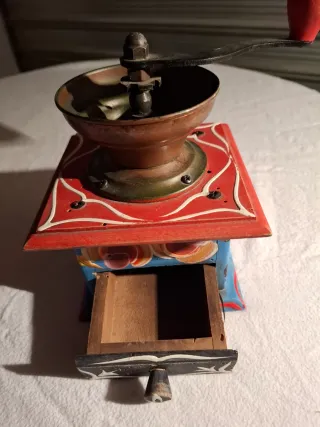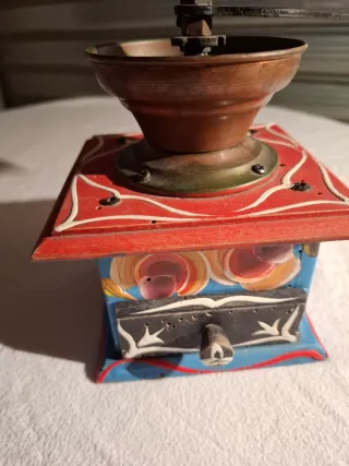 Macinino da caffè antico con decorazioni dipinte a mano. Un pezzo unico che aggiunge un tocco di fascino vintage alla tua casa. - Base in legno dipinta di rosso e blu. - Decorazioni floreali bianche e gialle. - Ciotola superiore in metallo. - Manovella per la macinatura. - qualche puntino di tarlo dovuto al tempo