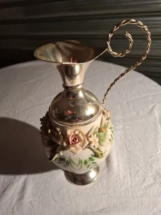 Raffinata brocca antica in stile Capodimonte, impreziosita da decorazioni floreali. - Dettagli floreali in rilievo. - Finitura in metallo lucido sulla parte superiore e base. - Decorazioni dipinte a mano con motivi vegetali.