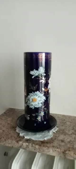 Elegante portafiori vintage risalente agli anni '20, completo di piattino coordinato. - Decorato con motivi floreali su fondo blu. - Dettagli dorati e applicazioni floreali. - Piattino sottovaso incluso.
