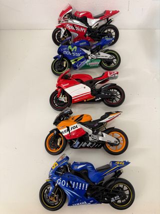 Lotto composto da 5 modellini di moto da collezione. - Modello 1: Rossi 46 Yamaha - Modello 2: Repsol Honda - Modello 3: Ducati Corse - Modello 4: Movistar Honda - Modello 5: Ducati Corse Spain's N°1