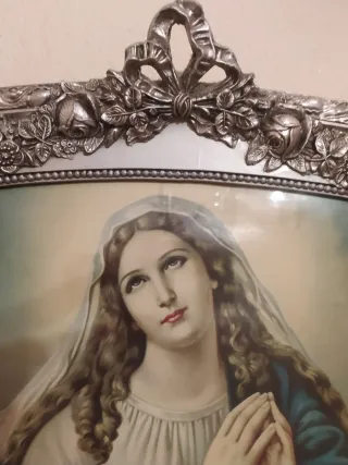 Bellissimo dipinto antico con una rappresentazione della Vergine circondata da angeli. La cornice è ovale e ha un design ornamentale. Caratteristiche: cornice ovale con dettagli, immagine della Vergine e angeli.