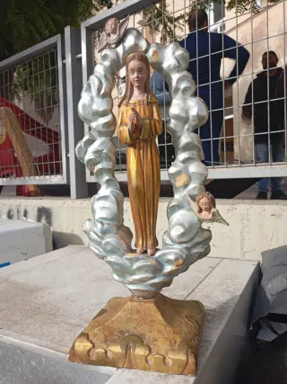 Statua religiosa dell'Immacolata Concezione, accompagnata da angeli. Dettaglio di alone dorato. Tunica bianca e manto blu con dettagli. Base decorata con velluto rosso e pizzo. Talleres Olot