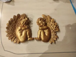 Set di due piccoli angeli decorativi con finitura dorata. Misurano circa 18x14 cm ciascuno. Dietro c'è il foro per appenderli. Design dettagliato di ali e corpo. Colore dorato brillante.