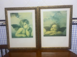 Set di due quadri decorativi con l'immagine degli angeli di Raffaello. Sono da galleria. I telai sono in ottime condizioni. Le lastre sono un po' ingiallite per essere state conservate in soffitta per molti anni. 79x59 cm. Pesano 4,1 kg ciascuno.