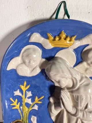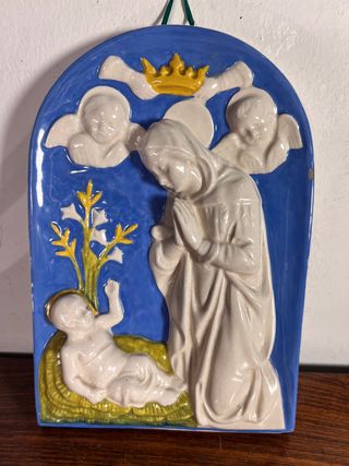 Piastra in ceramica dipinta a mano raffigurante la madonna e gli angeli, realizzata nel 1960.