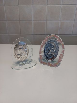 Oggettistica sacra con angeli e madonna con bambino in vetro decorato venduti a 10 euro al pezzo