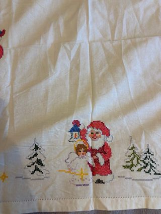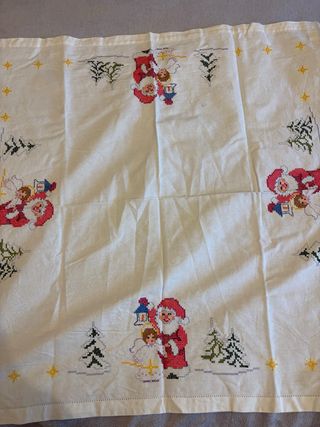 Tovaglietta in tessuto con ricamo a punto croce a tema natalizio. Raffigura Babbo Natale con un angelo e alberi. - Ricamo a punto croce. - Motivo natalizio con Babbo Natale e angeli. - Decorazioni con alberi e stelle. c’è una piccola macchina misura 78x78