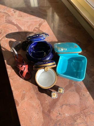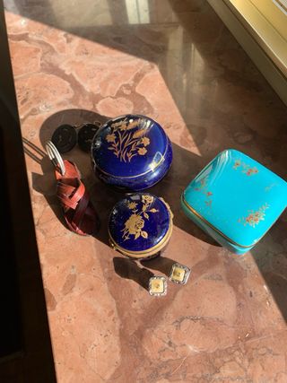 Set di contenitori vintage in ceramica, perfetti per aggiungere un tocco di eleganza alla tua casa. - Un contenitore blu scuro con decorazioni dorate. - Un contenitore turchese con decorazioni floreali dorate. - Un piccolo contenitore blu con bordo dorato e coperchio decorato. - Un paio di gemelli quadrati con dettagli dorati vintage - Un portachiavi - Un paio di orecchini legno