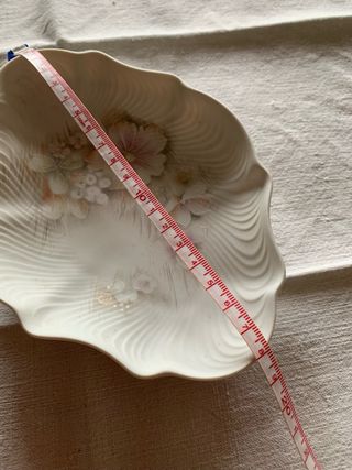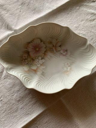 Elegante piatto in ceramica con decorazioni floreali. La forma ondulata e i delicati colori lo rendono un pezzo unico. - Ceramica di alta qualità. - Motivo floreale con fiori rosa e bianchi. - Contenitore bianco con coperchio e fiori - Barattolo decorato marrone - Contenitore porta profumo per biancheria