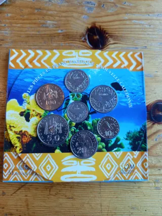 Serie di monete della Nuova Caledonia del 2002. - Monete con valore di 100, 50, 25, 20, 10 e 5 franchi. - Dettagli raffiguranti flora e fauna locali.