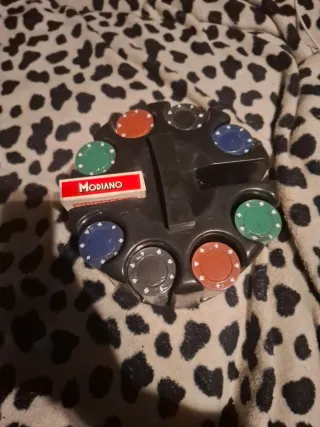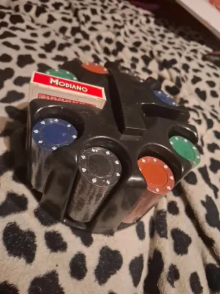 Set di fiches da gioco Modiano. - Vassoio porta fiches nero. - Fiches di vari colori: rosso, verde, blu, nero. - Include un mazzo di carte Modiano.