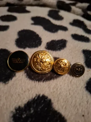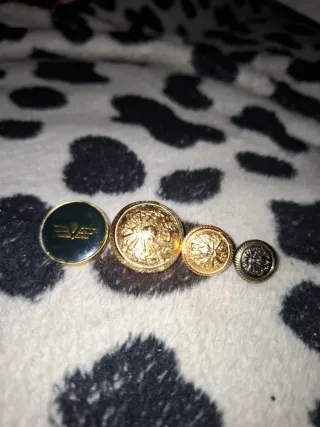 Set di quattro bottoni, alcuni dorati con decorazioni a rilievo e uno nero con logo. - Bottoni in metallo. - Un bottone nero con logo. - Tre bottoni dorati con disegni a rilievo.