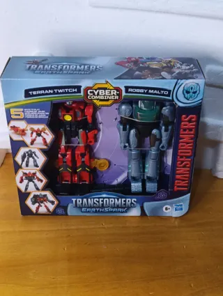 Set de figuras de acción Transformers Earthspark Cyber-Combiner. Cambia la forma de tus héroes favoritos con 9 movimientos. Incluye a Terran Twitch y Robby Malto. Apto para niños a partir de 6 años. Set di action figure Transformers Earthspark Cyber-Combiner. - Include Terran Twitch e Robby Malto. - Adatto per bambini dai 6 anni in su.