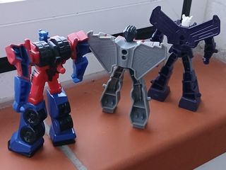 Set di tre robot Transformers, risalenti agli anni '90. I robot sono in plastica e presentano colori vivaci. - Robot rosso e blu - Robot grigio, rosso e blu - Robot viola e bianco