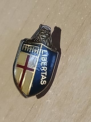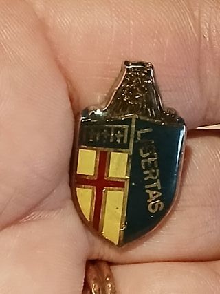 Spilla decorativa con stemma e leone.SPILLA PINS DISTINTIVO SIMBOLO STEMMA BADGE SCUDO LOGO CREST TURISMO BOLOGNA - Design a scudo con croce. - Scritta Libertas in rilievo. - Dettaglio di un leone stilizzato sulla parte superiore.