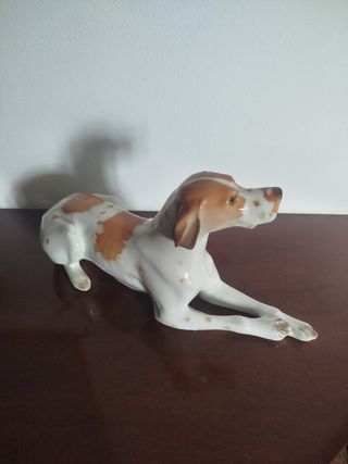 Bellissima statua anni 50 di un segugio in porcellana, di manifattura russa Lomonosov San Pietroburgo - Realizzata in porcellana di colore bianco e marrone. - Raffigura un cane sdraiato. - Pezzo unico da collezione.