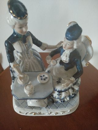 Bellissimo paio di statuette in porcellana raffiguranti due dame intente a bere il tè. Sono in ottime condizioni e presentano dettagli molto raffinati. - Realizzate in porcellana di alta qualità - Dipinte a mano con colori blu e bianco - Rappresentano due dame elegantemente vestite - Perfette per collezionisti o amanti dell'oggettistica vintage