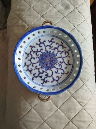 Elegante vassoio in porcellana veneziana denominato VENETIAN LAGOON con decorazioni floreali blu e dorate. Presenta un bordo traforato e due manici dorati diametro 19 cm - Design floreale intricato. - Bordo traforato decorativo. - Manici dorati per un tocco di classe.