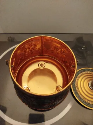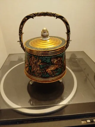 Elegante barattolo di latta con decorazioni in rilievo e manico., anni 50 - Finitura dorata e verde acqua. - Dettagli in stile antico. - Manico decorato con motivi floreali. - Base con piedini. - Coperchio con pomello decorativo.