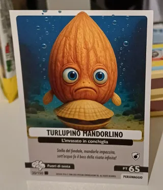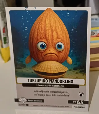 Carta Turlupino Mandorlino della serie Skifidol Brainrot. - Personaggio: Turlupino Mandorlino - Punti: 65 - Numero: 20/150 - Serie: L'invasato in conchiglia