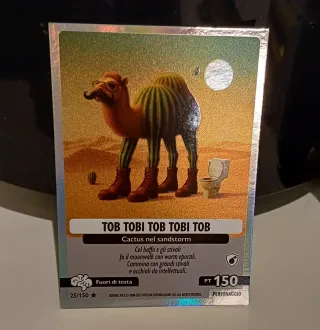 Carta Cactus nel sandstorm della serie Skifidol Brainrot. - Personaggio: TOB TOBI TOB TOBI TOB - Numero: 25/150 - PT: 150 - Descrizione: Col baffo e gli stivali fa il moonwalk con worm epocali. Cammina con grandi stivali e occhiali da intellettuali.