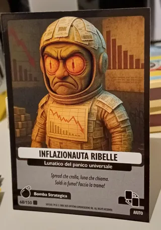 Carta Inflazionauta Ribelle dal gioco Skifidol. - Numero carta: 68/150 - Edizione: Lunatico del panico universale - Illustrazione a tema finanziario con grafico in discesa. - Testo: Spread che crolla, luna che chiama. Soldi in fumo? Faccio la trama! - Tipo: Bomba Strategica