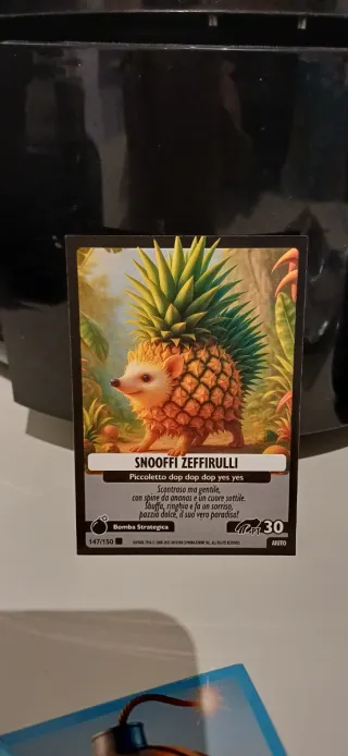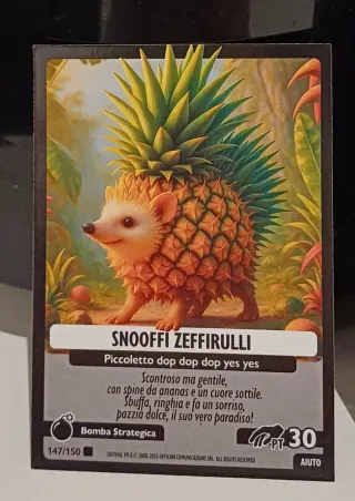 Carta Snooffi Zeffirulli della serie Skifidol Brainrot. - Personaggio: Snooffi Zeffirulli - Descrizione: Piccoletto dop dop dop yes yes. Scontraso ma gentile, con spine da ananas e un cuore sottile. Sbuffa, ringhia e fa un sorriso, pazzia dolce, il suo vero paradiso! - Tipo: Bomba Strategica - Numero: 147/150 - Valore: 30