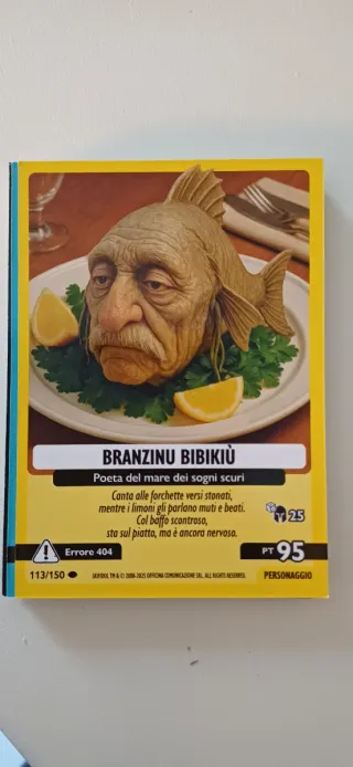 Carta Branzinu Bibikiù della serie Skifidol Brainrot. Fa parte della collezione Personaggio. - Numero carta: 113/150 - Punti: 95 - Valore: 25 - Errore 404