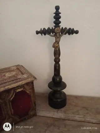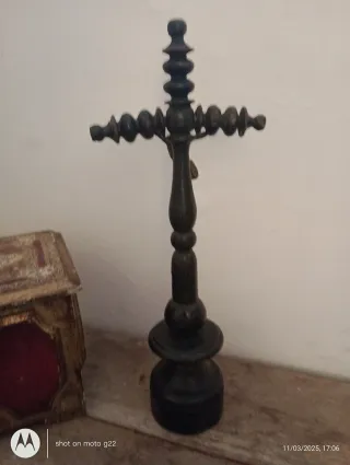 Elegante crocifisso da tavolo, realizzato in legno ebanizzato e Cristoi in bronzo. - altezza 34 cm - Base stabile per appoggio. - Design classico e raffinato.