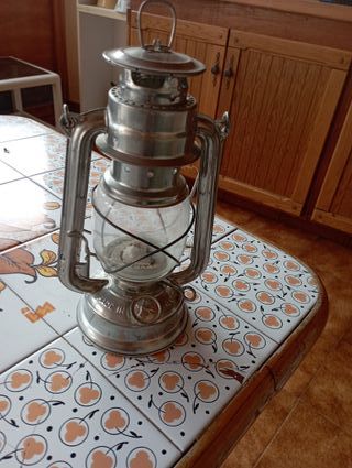 Antico quinqué della Repubblica Democratica Tedesca (RDT). In ottime condizioni, mai usato. Pezzo raro prodotto prima della caduta del Muro di Berlino. Il ritiro a mano è preferibile, la spedizione tramite Wallapop non funziona con la penisola, solo nelle Canarie. Realizzato in metallo e vetro. Design classico di lampada ad olio. Incisione 'Made in GDR' sulla base. Sigillo con stella sulla base.