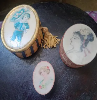 Set di tre scatoline decorative, perfette per collezionisti o come elementi d'arredo vintage. Scatolina in ceramica e tessuto blu e giallo alta 7.5 dimensioni 5.5 cm la figura sul coperchio è applicata e si può togliere Scatolina ritratto dipinto geisha in carta e tessuto dimensioni 6.5 x 5 cm Scatolina carta con dipinto viso dama dimensioni 4.5 x 3 cm lotto bellissimo .