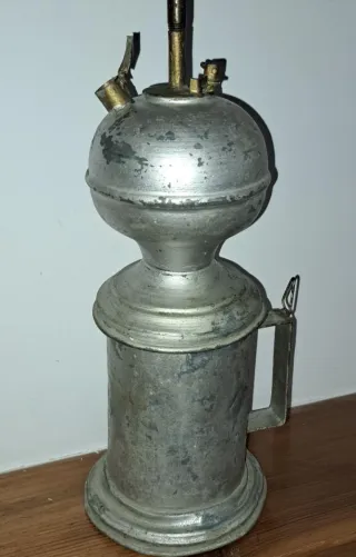 Lampada da tavolo al carburo con design sferico e base cilindrica. Modello raro da tavolo e da portare in casa, in ottimo stato degli anni '40. Non testata, ma dovrebbe funzionare. Preferibile ritiro a mano nel sud di Tenerife. Se spedita, le spese di spedizione a carico dell'acquirente, 12,5 euro. Wallapop spedisce solo nelle Canarie con la penisola non funziona. Materiale metallico argentato. Maniglia laterale. Meccanismo di accensione visibile.