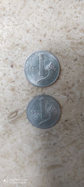 Due monete da 1 Lira Italiana, coniate nell'anno 1955. - Anno di coniazione: 1955 - Valore nominale: 1 Lira