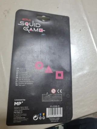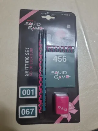 Set di cancelleria a tema Squid Game, ispirato alla serie Netflix. - Include matite con design a tema. - Blocco note con numero 456. - Gomma da cancellare. - Gomma cancellino con numeri giocatore 001 e 067.