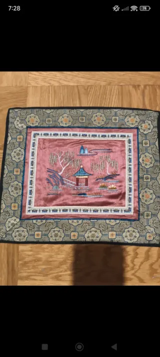 Bellissimo arazzo in seta con un paesaggio tradizionale giapponese ricamato. Risalente agli anni 30 del secolo scorso. Misure 29x25 cm. - Motivo: Pagoda, salici piangenti e fiori di loto. - Materiale: Seta. - Bordatura decorativa. Ideale per la realizzazione di un quadro o un cuscino