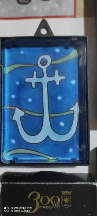 Due elementi decorativi in vetro con design marittimo. - Un pezzo raffigura un'ancora su sfondo blu con puntini bianchi. - L'altro pezzo presenta una rosa dei venti stilizzata su sfondo blu. - Entrambi gli oggetti sono incorniciati in nero e presentano un gancio per appenderli. - Le cornici nere riportano la scritta 300 Anni.