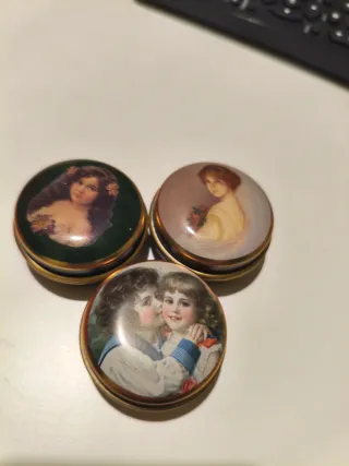 Set di tre scatoline porta pillole in metallo, ognuna decorata con un'immagine vintage. Buone condizioni, 4 cm di diametro - Materiale: Metallo - Decorazioni: Immagini di bambini e donne d'epoca - Quantità: 3 pezzi