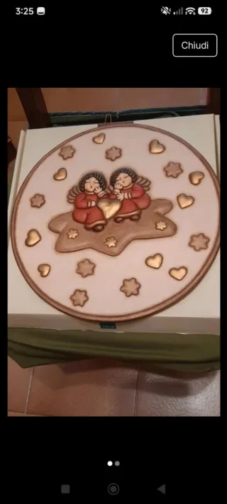Piatto decorativo Thun a tema invernale, raffigurante due angioletti su una nuvola con un cuore dorato. In ceramica originale Thun. Nuovo nella confezione originale. Si può anche appendere. 34 cm di diametro circa - Design con angioletti e cuori. - Decorazione a tema invernale. - Finitura con dettagli dorati.
