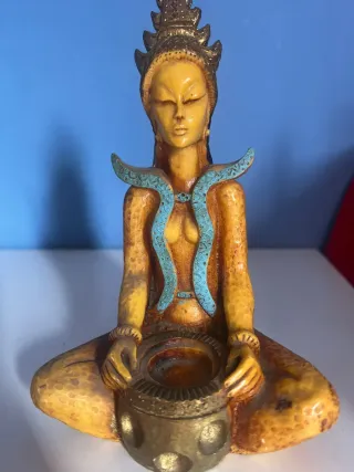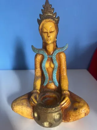 Statua decorativa in resina raffigurante una dea seduta con un vaso. - Dettagli dorati e blu. - Posizione meditativa.